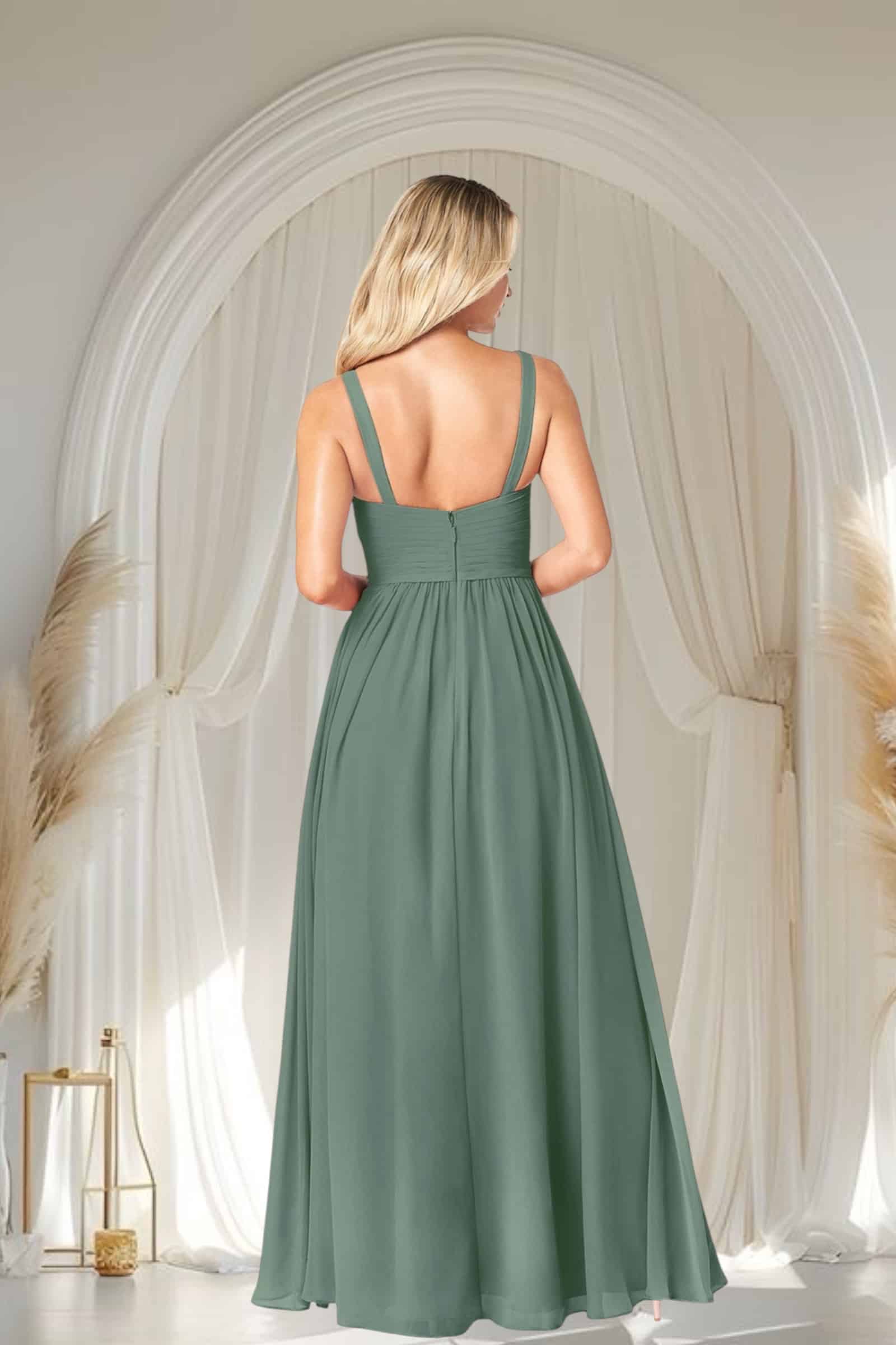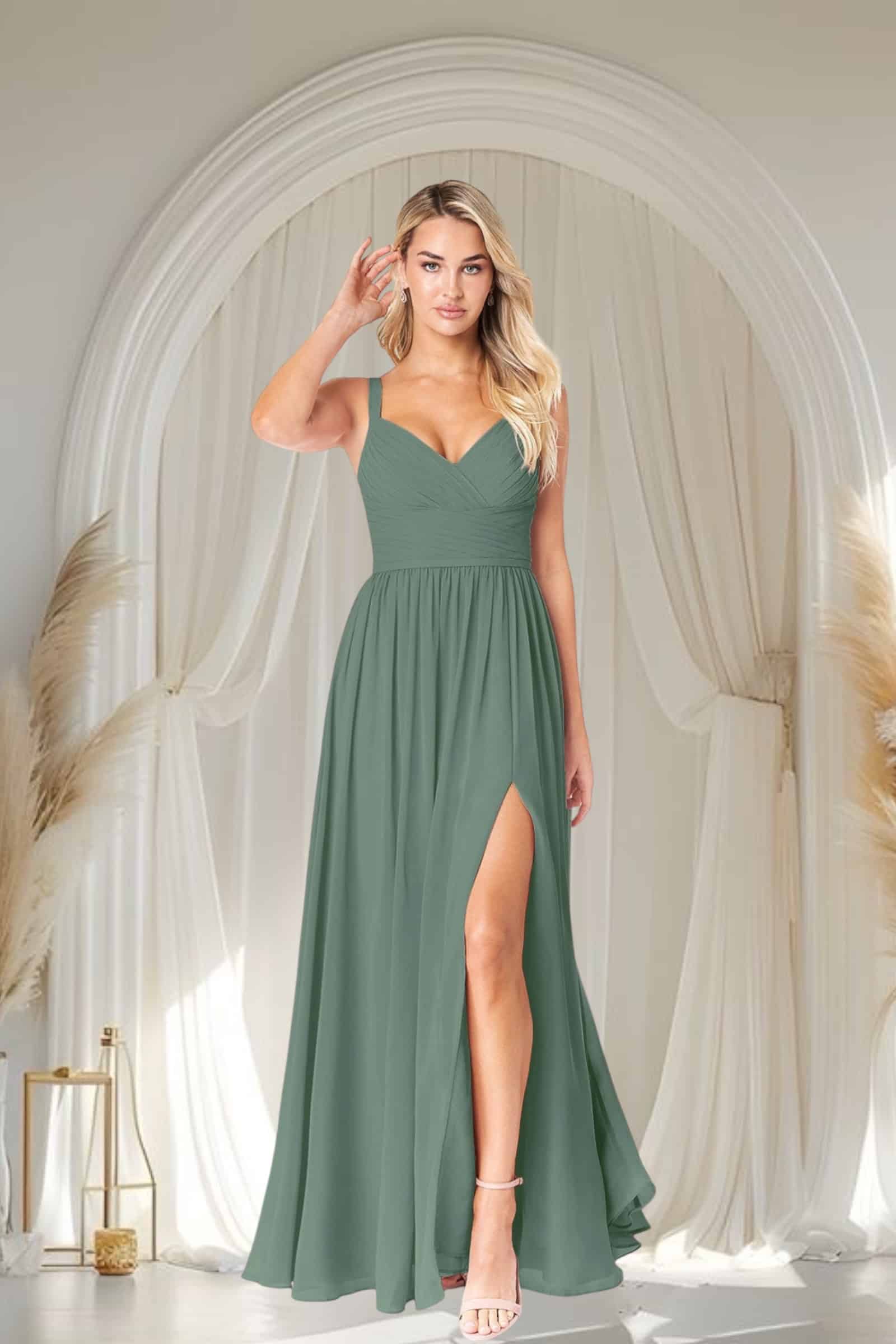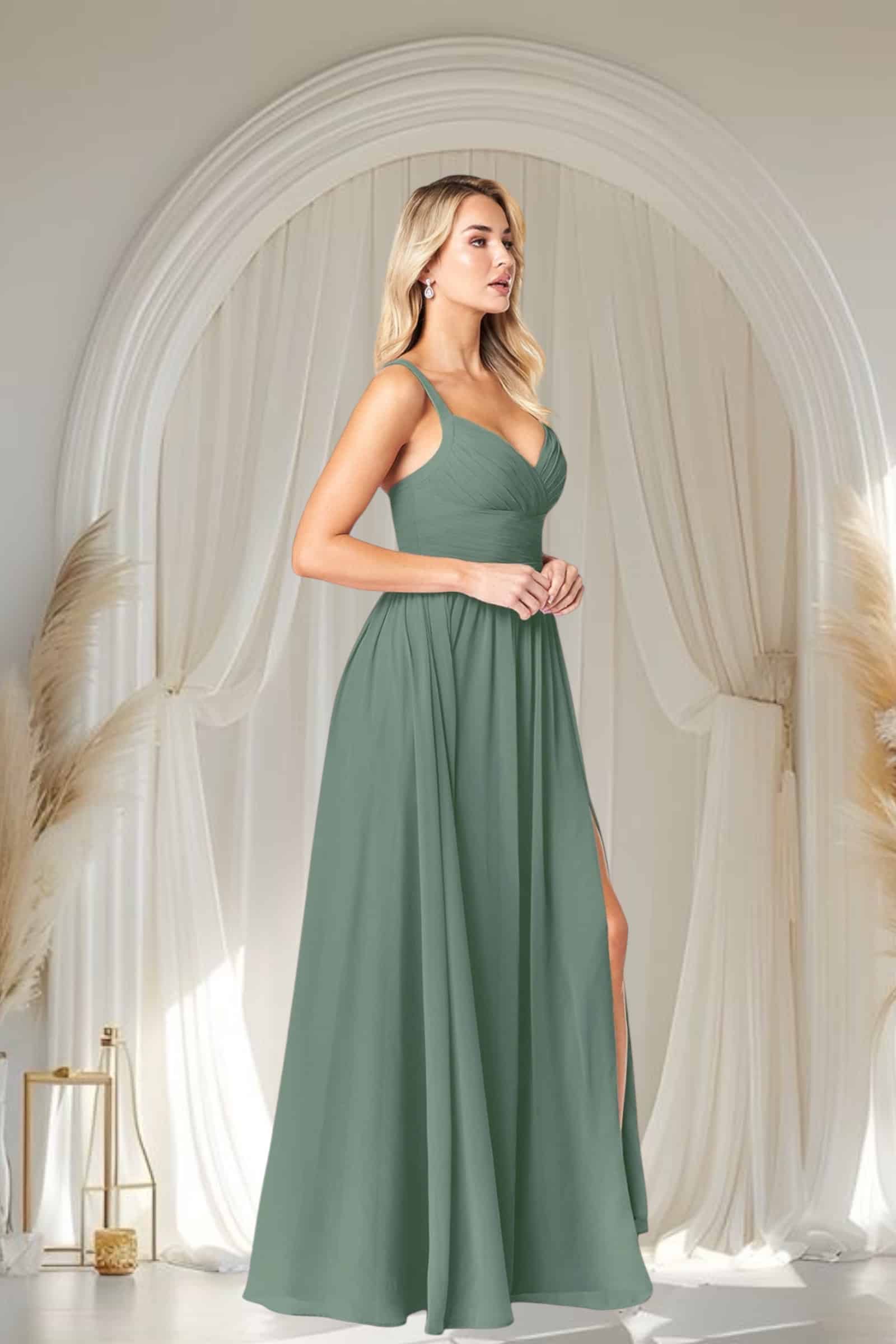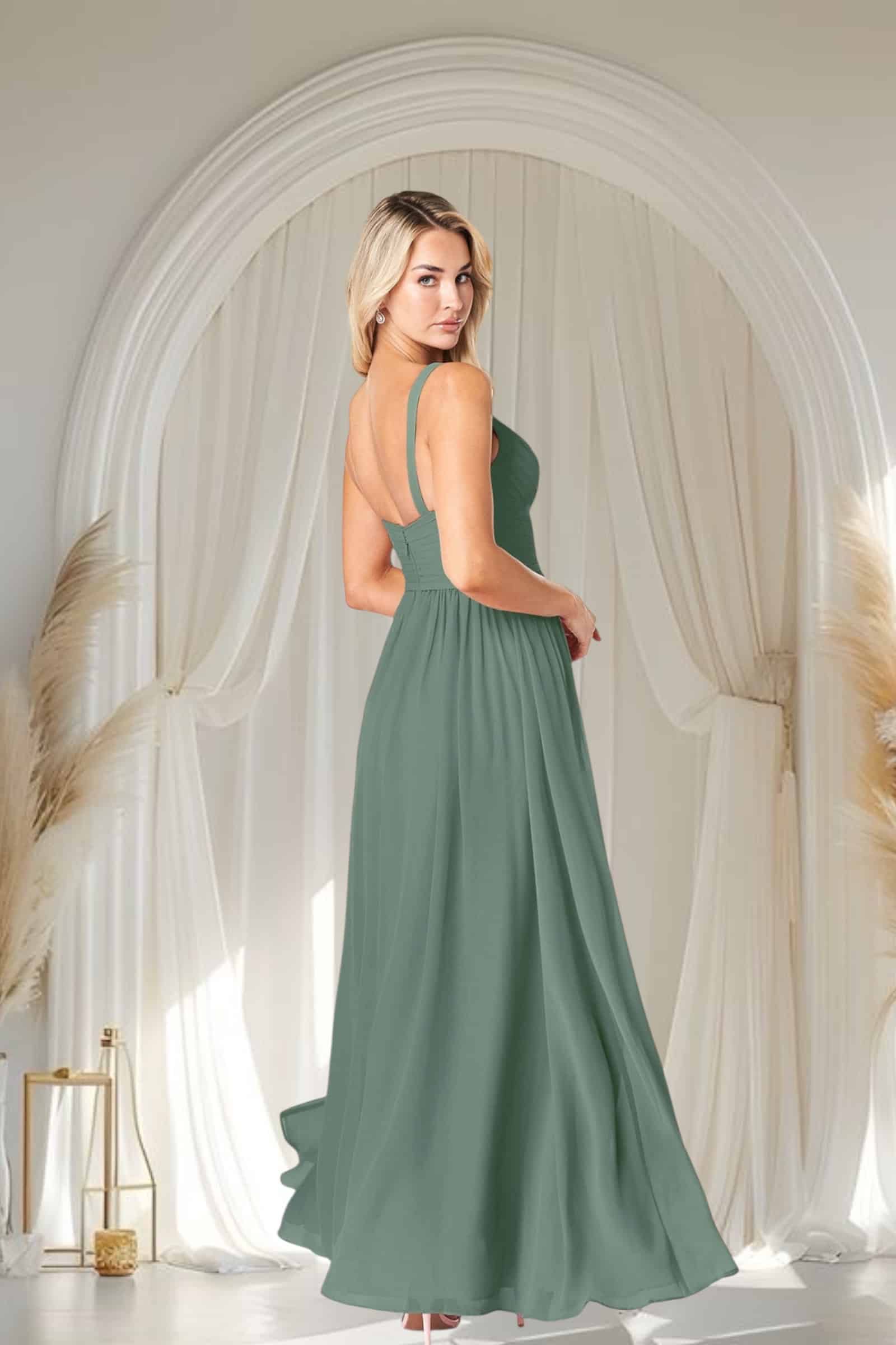 Deslumbra con la serenidad y sofisticación de este Vestido de Gala, ahora en Temuco en un cautivador verde eucalipto. Confeccionado en gasa, su elegante corte en A fluye con gracia, mientras que el plisado estratégico en la cintura y el busto realza tu figura de forma impecable.