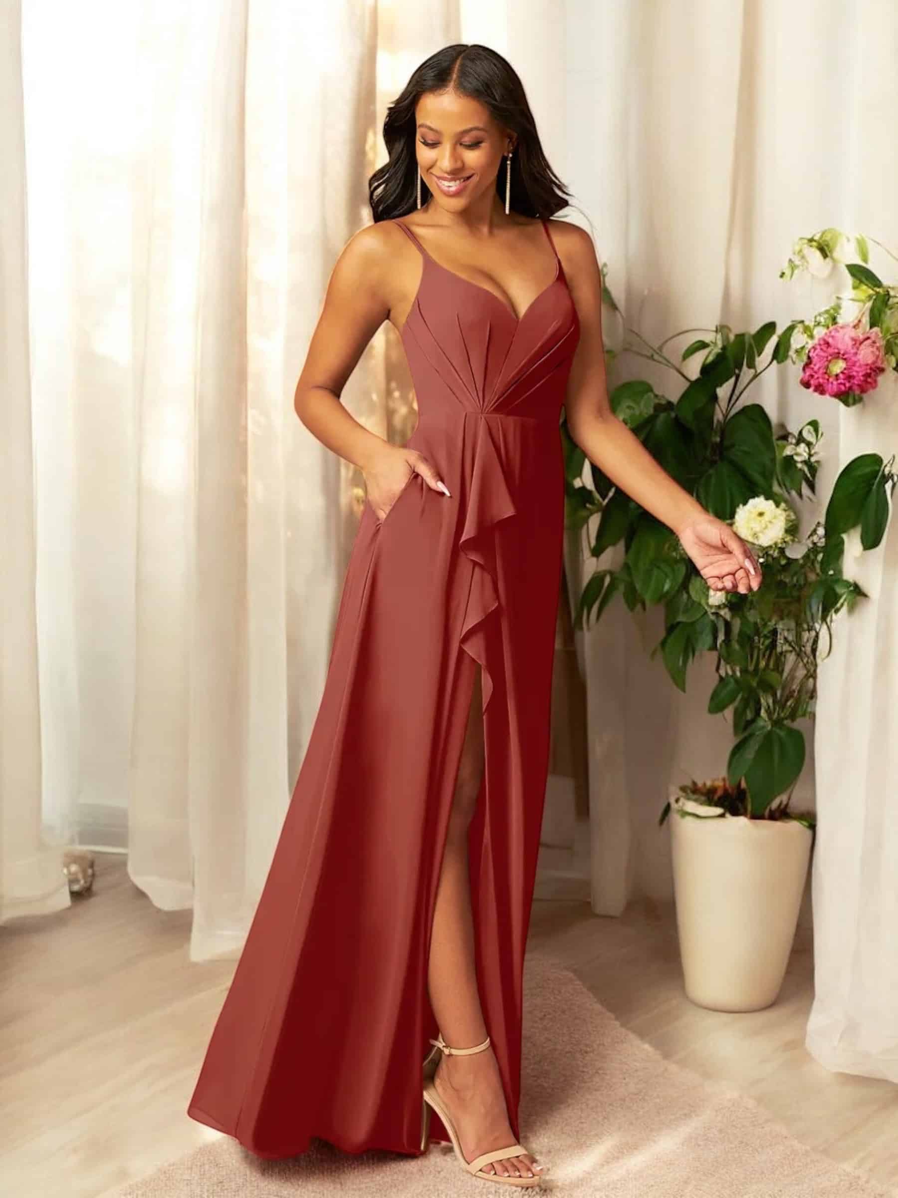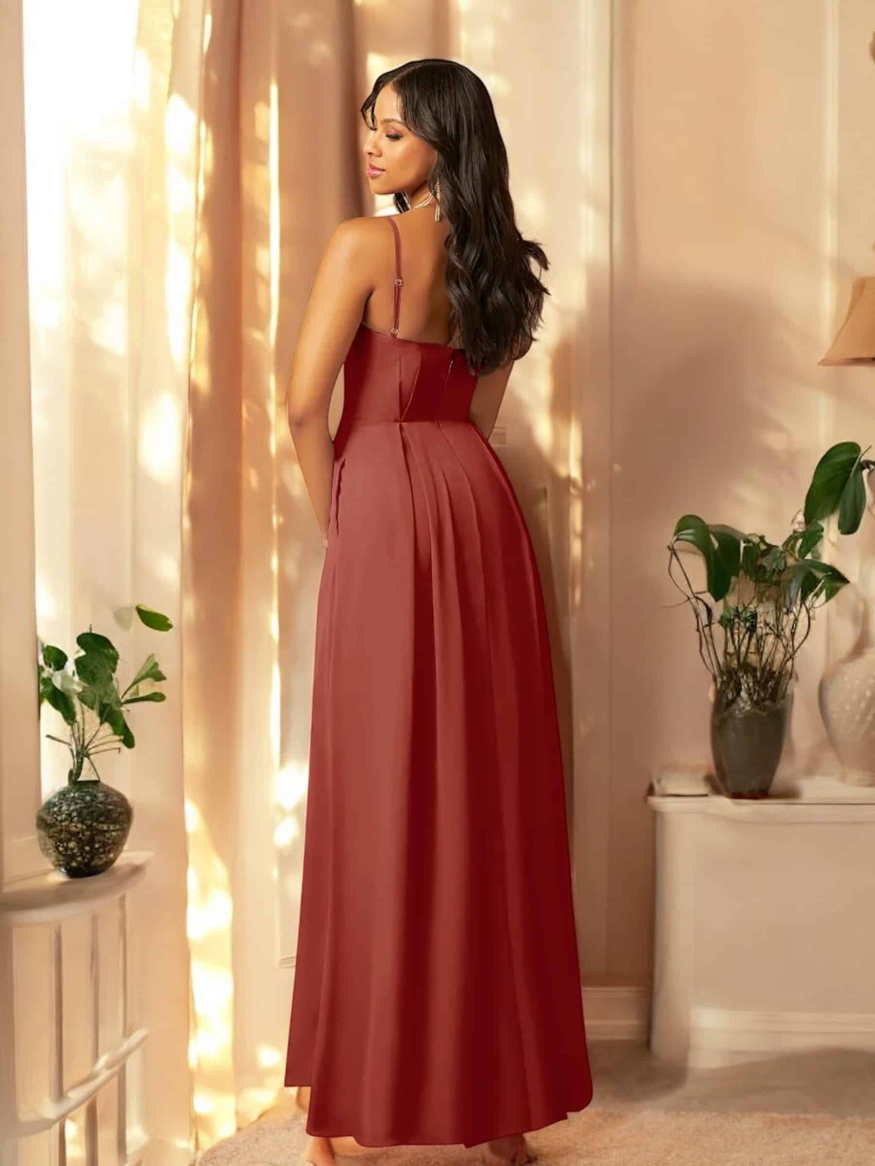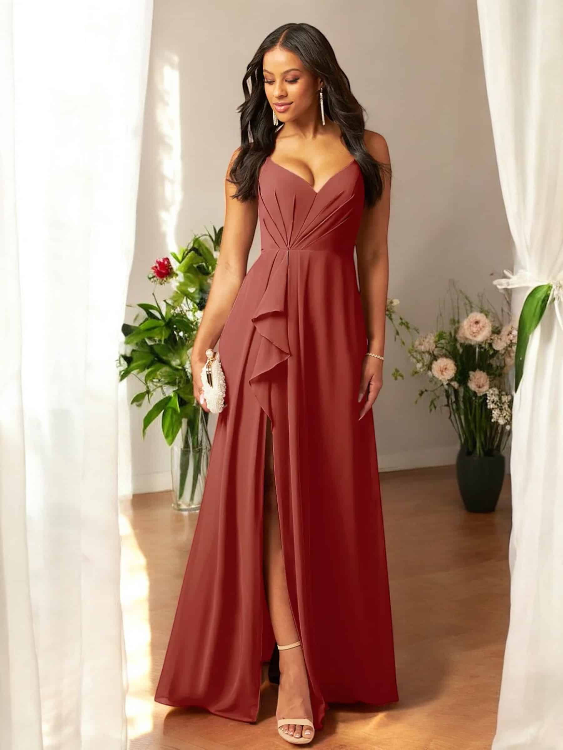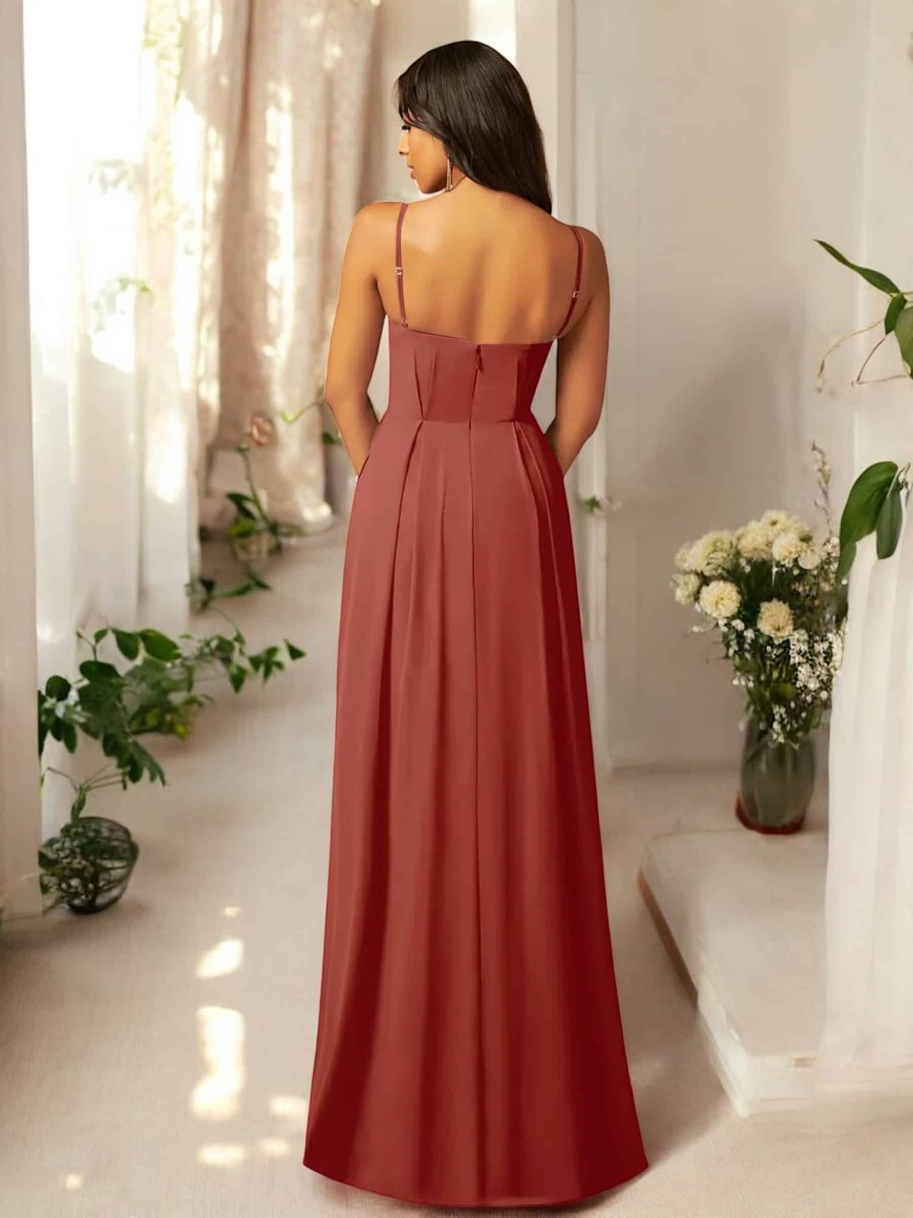 Vestido de Fiesta Terracota: Gasa y Abertura Juvenil para un Glamour Vibrante