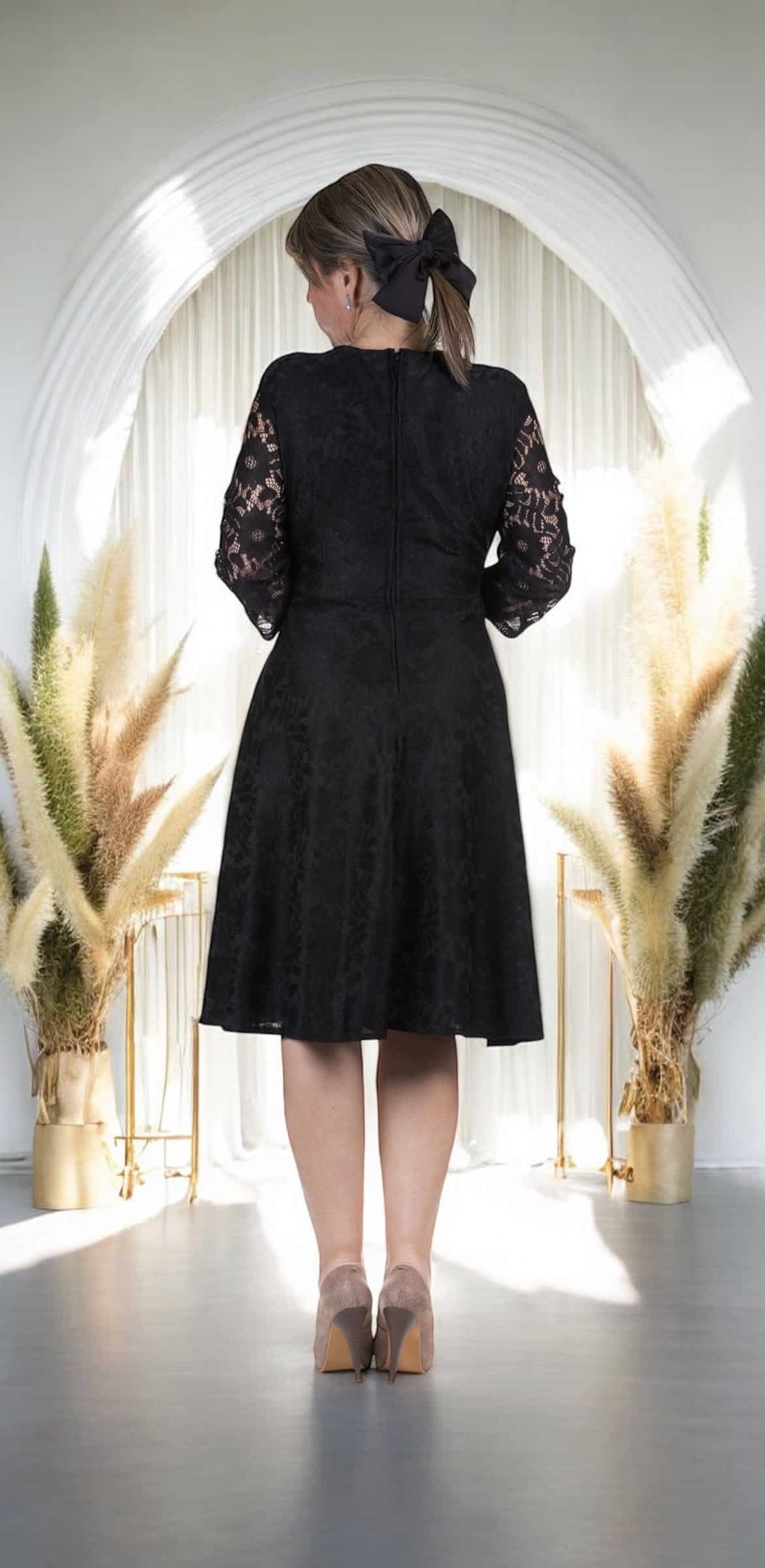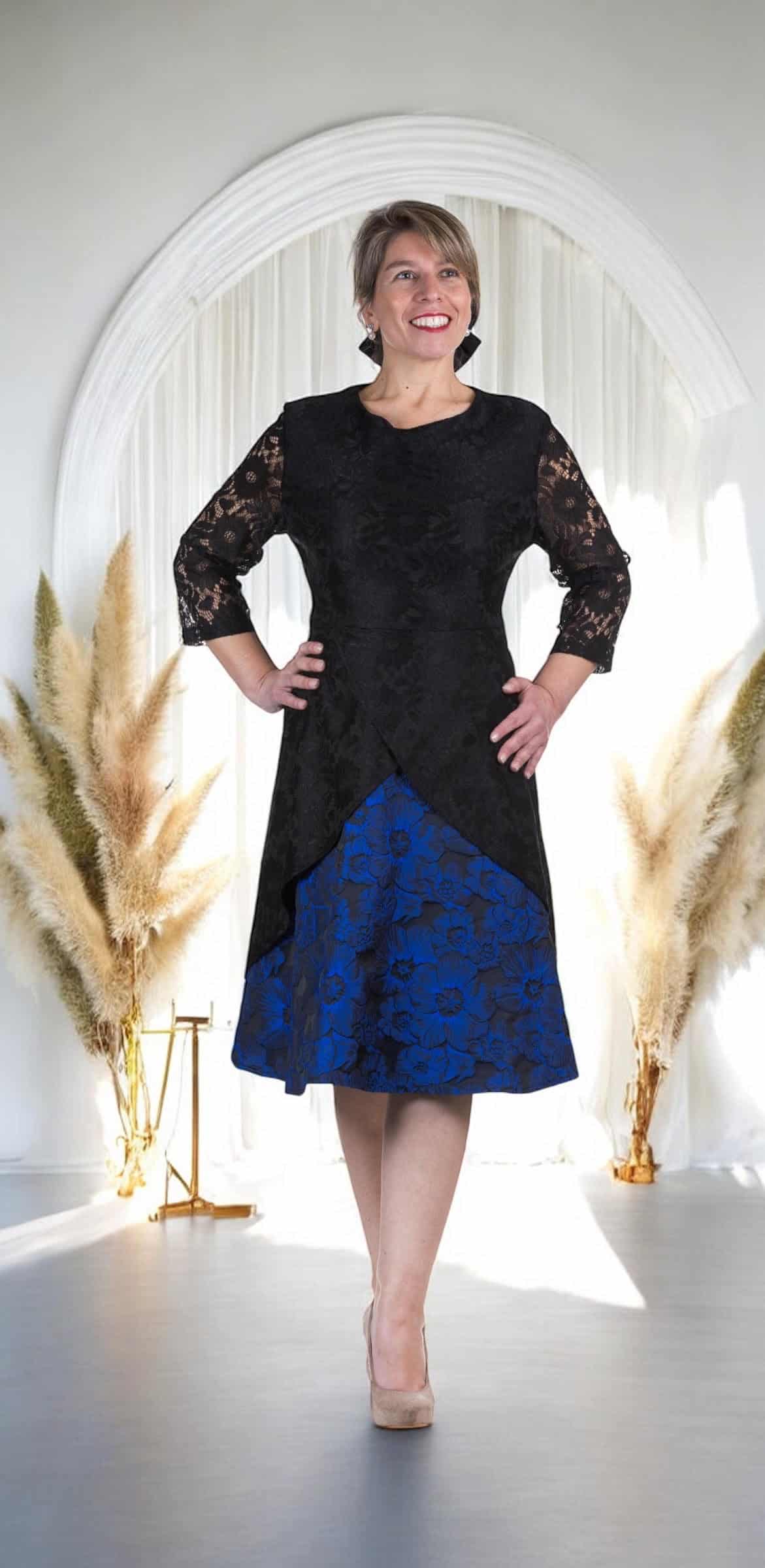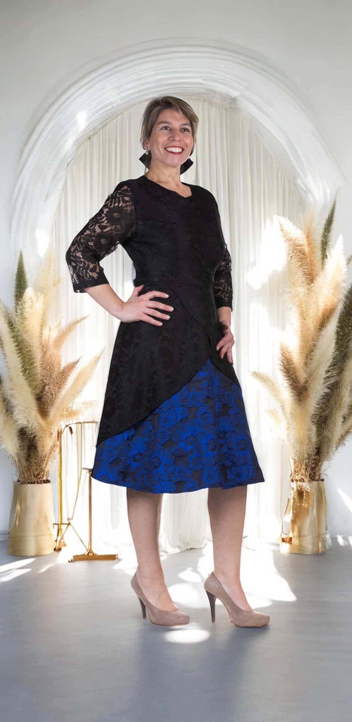 Sumérgete en la elegancia más pura con este sublime Vestido de Fiesta, una pieza que rinde homenaje al clásico negro mientras le infunde un toque de iluminación y modernidad. La parte superior, con su exquisito encaje, ofrece una textura delicada y un diseño intrincado que evoca romanticismo y sofisticación, mientras que la falda, elaborada en tafetán estampado y texturizado, añade una dimensión visual y táctil única. La riqueza del tafetán, con su brillo sutil y su cuerpo estructurado, complementa a la perfección la ligereza del encaje.