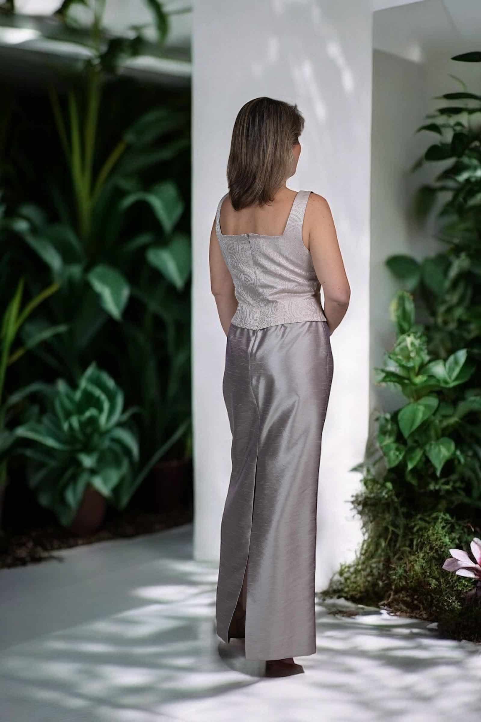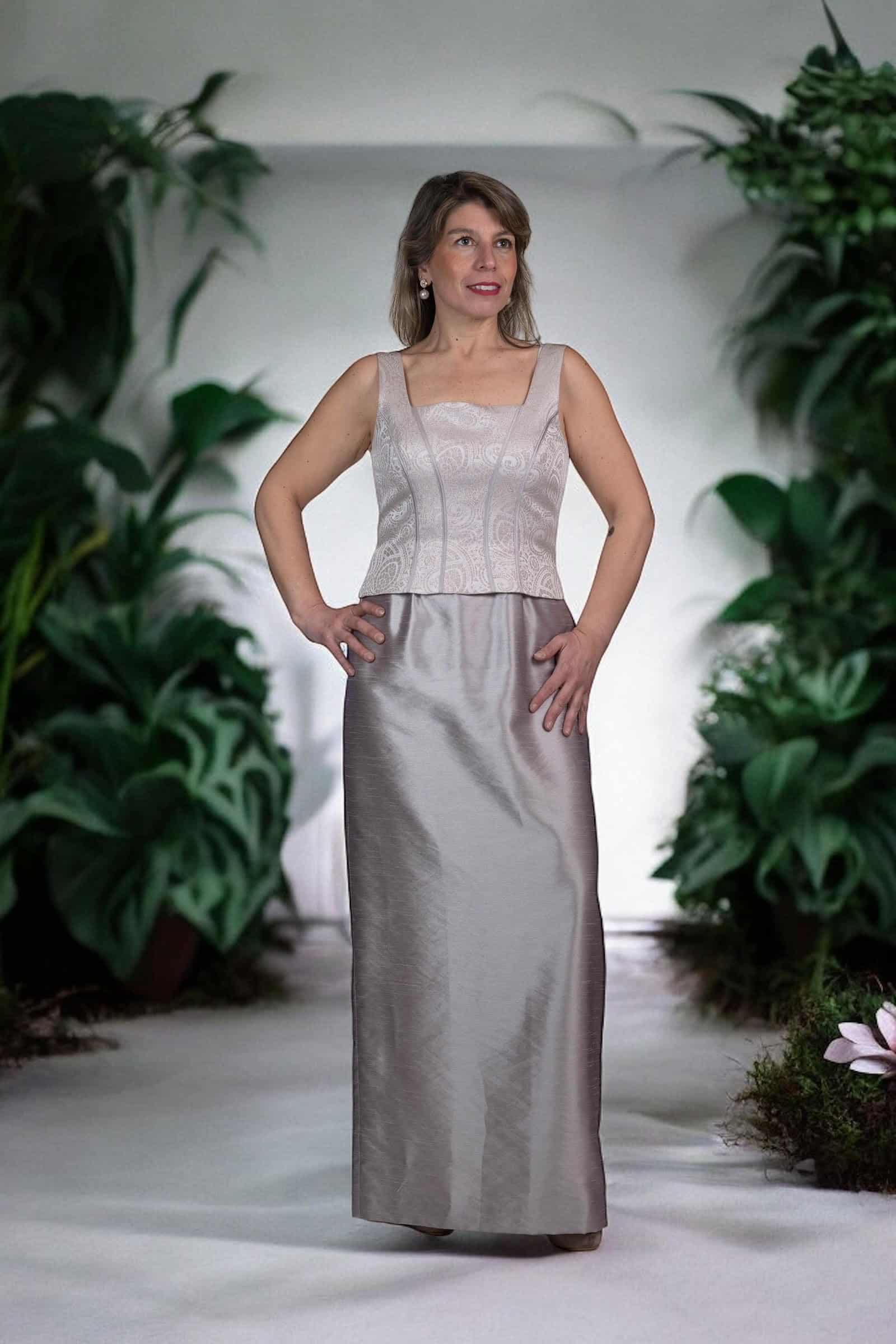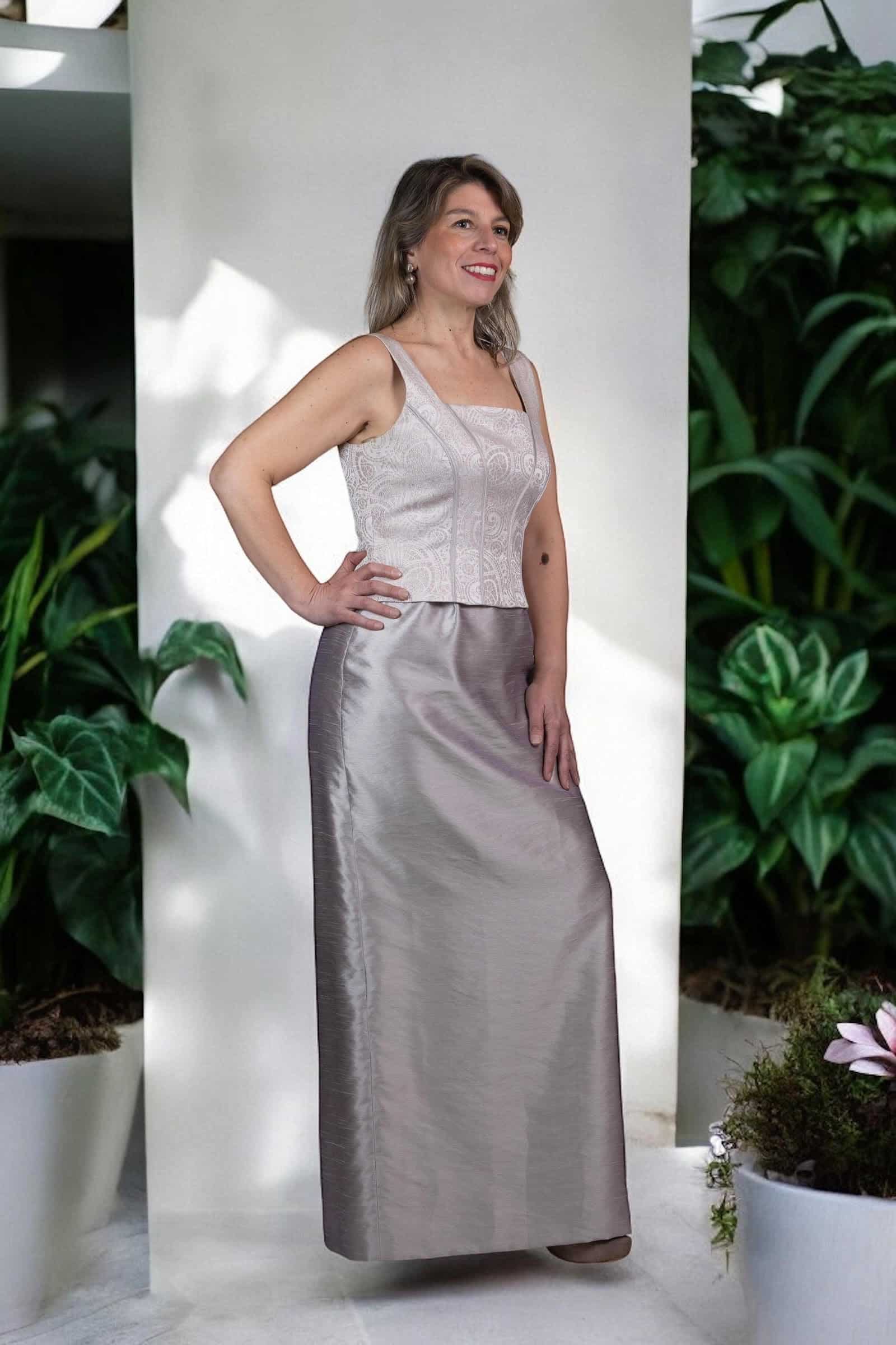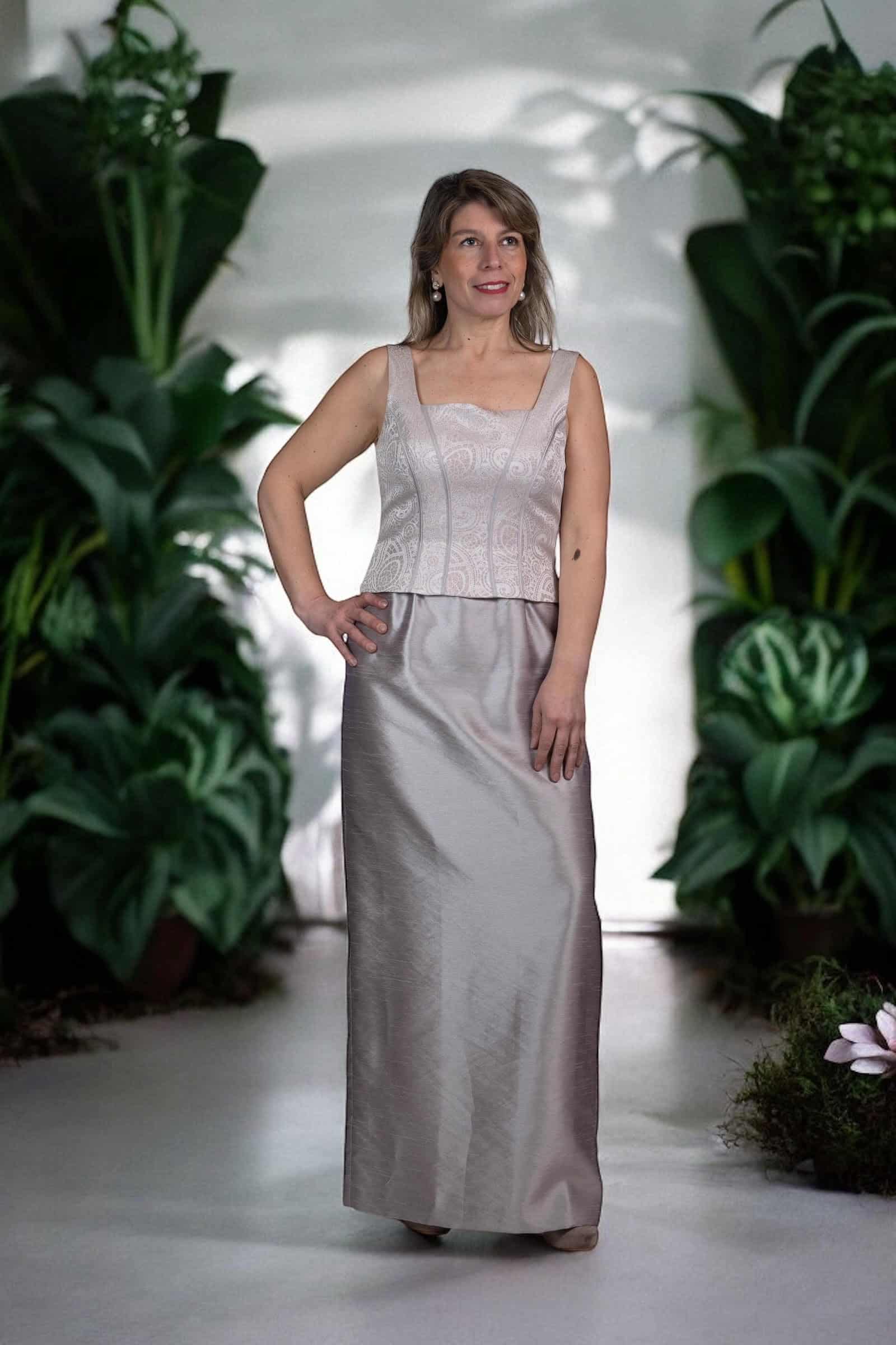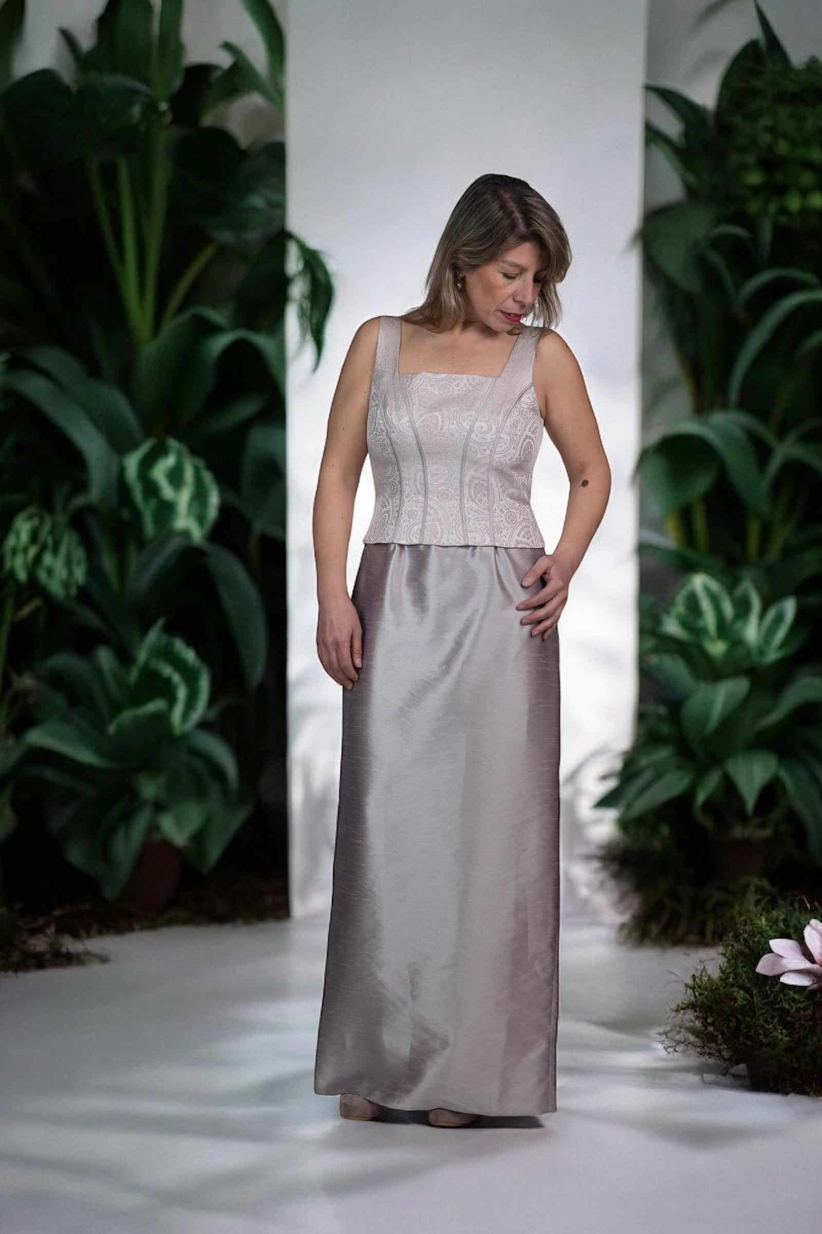 Haz una entrada memorable con este excepcional Vestido de Fiesta en un cautivador tono plateado ostra, que evoca el brillo sutil y la elegancia atemporal. Este diseño es una verdadera obra de arte textil, confeccionado con la riqueza del shantung que aporta una caída estructurada y un lustre delicado, combinado con la sofisticación del jacquard que introduce una textura sutil y patrones intrincados que capturan la luz de manera magistral.